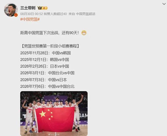 全运会结束之后,中国男篮就会马不停蹄开启新的一轮集训,时间极其紧迫,因为11月28日便要正式开启冲击27年世界杯参赛名额的世预赛之旅,主场VS韩国;12月1日,客场VS韩国。
